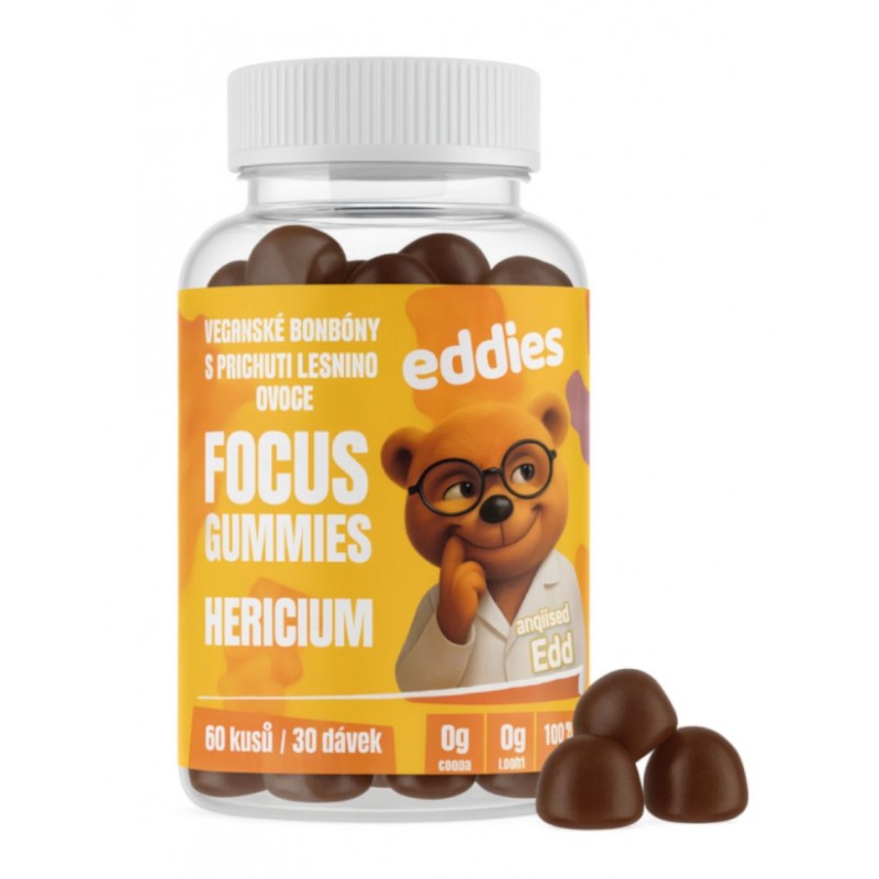 Veganské gumídky s extraktem z Lví hřívy (Hericium erinaceus) pro podporu paměti, koncentrace a mentální výkonnosti. 60 lahodných kousků v balení, bez cukru a lepku, s příchutí lesního ovoce.