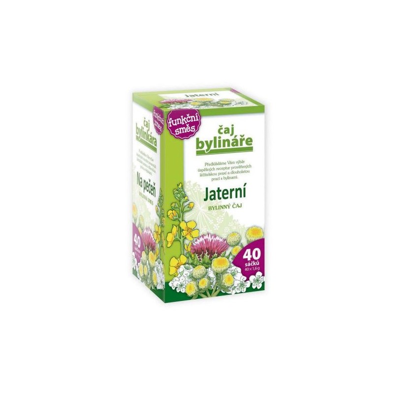 Čaj Váňa Jaterní n.s. 40x1.6g. Jaterní čajČaj příznivě působí na posilnění činnosti jater, pomáhá při jejich detoxikaci a podporuje trávení.Složení: smil květ, ostropestřec plod, pampeliška kořen, benedikt nať, dvouzubec nať, řepík nať.Dávkování: 2 šálky za den.Balení: 40 x 1.6 g
